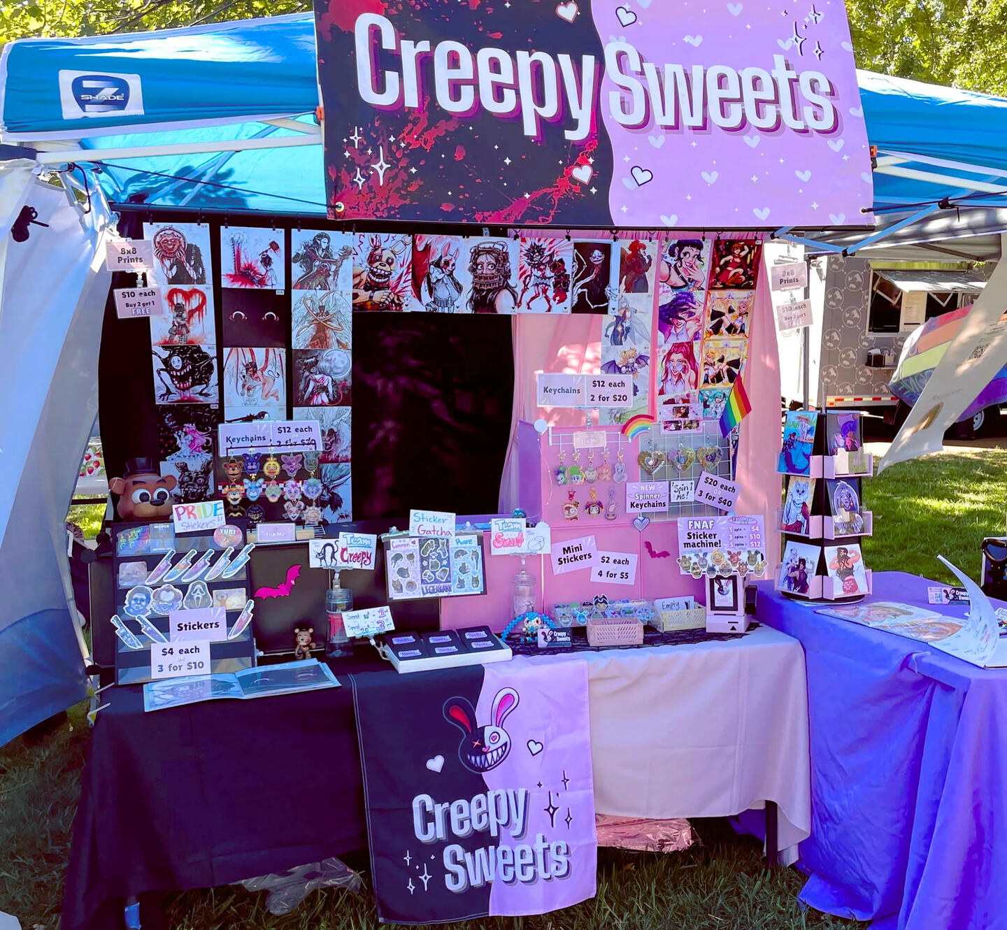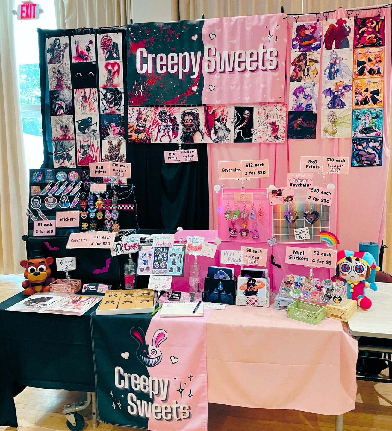Hello! I'm Creepy Sweets, but you can call me Creepy.I'm a solo convention artist with a love of all things creepy and sweet! I enjoy cartoons, video games, and horror, with some of my favorites being Five Nights at Freddy's, The Owl House, and Genshin Impact.